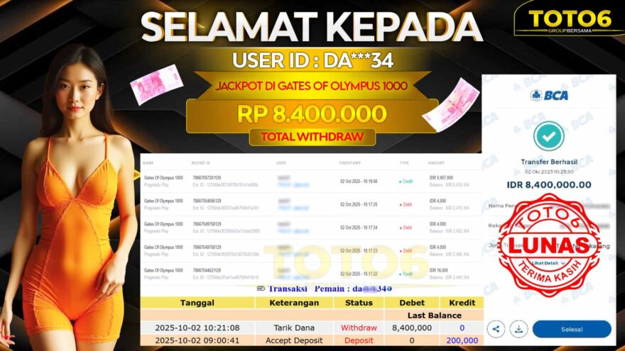 Selamat Kepada Member Setia TOTO6 dengan USER ID : DA***34 Jackpot Di Permainan Slot GATES OF OLYMPUS 1000 sebesar RP 8.400.000,- LUNAS langsung mendarat ke rekening tanpa bertele – tele. Terimakasih telah mempercayakan TOTO6 sebagai Situs Bandar Terpercaya dan Terjamin Aman! Tunggu apalagi? Daftar sekarang juga bersama TOTO6 dan dapatkan berbagai promo menarik setiap harinya.