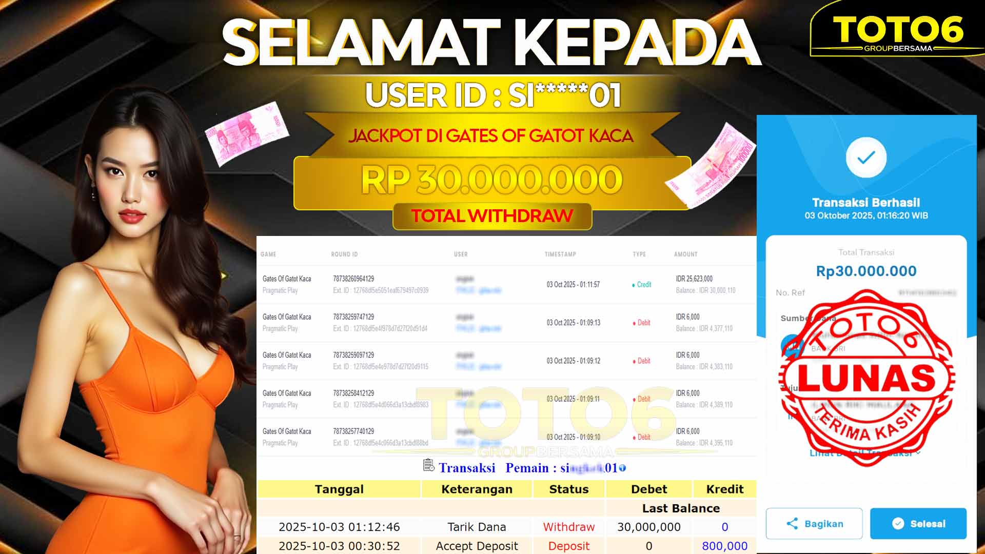 Selamat Kepada Member Setia TOTO6 dengan USER ID : SI*****01 Jackpot Di Permainan Slot GATES OF GATOT KACA sebesar RP 30.000.000,- LUNAS langsung mendarat ke rekening tanpa bertele – tele. Terimakasih telah mempercayakan TOTO6 sebagai Situs Bandar Terpercaya dan Terjamin Aman! Tunggu apalagi? Daftar sekarang juga bersama TOTO6 dan dapatkan berbagai promo menarik setiap harinya.